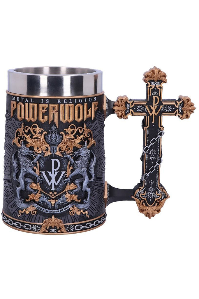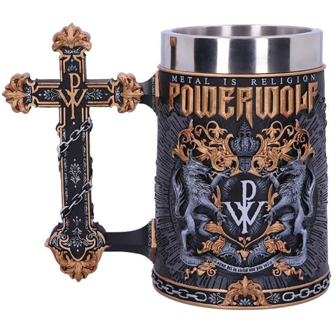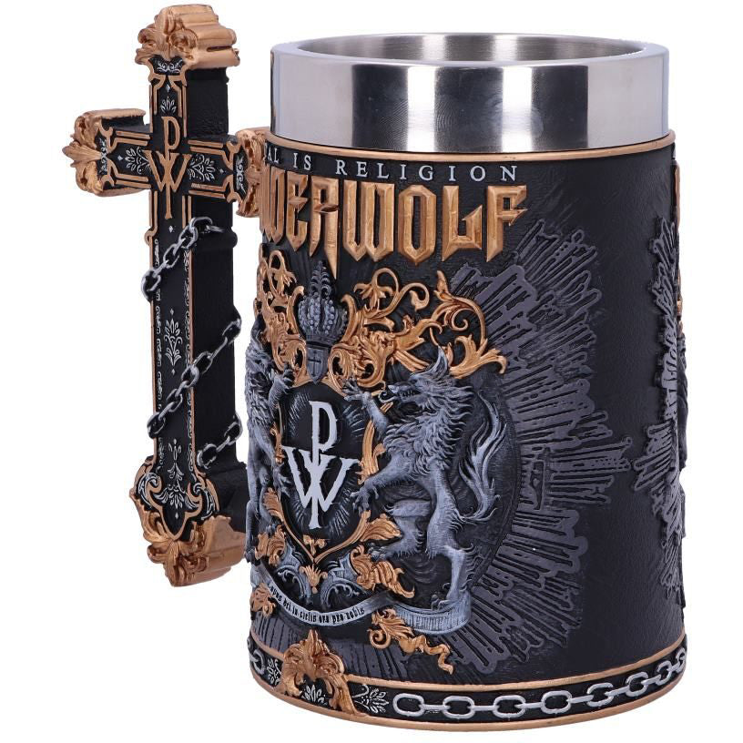 Join the Army of the Night and bang your heads to Heavy Metal masters Powerwolf, with this officially licensed Tankard! Detailed in Gold and emblazoned with their 'Metal Is Religion' coat of arms, this Tankard has been cast in the finest resin before being expertly hand-painted and features a stainless steel insert for ease of cleaning.