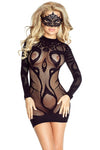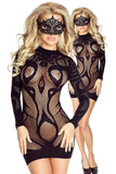 A very sexy mini dress styled in a fish net body design which clings against the body. Features a striking design made up of a variation of shapes and thicknesses.