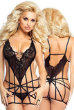 A very sexy and original design made from delicate and impressive lace. The chest is covered with a soft and silky fabric decorated with a floral motif. This chemise is merged with a strappy bottom. All the straps can be adjusted. The front of the chemise is open at the chest with tied ribbon, and the back of the chemise is open. Two bows also feature on the straps at the top of the chemise. Matching thong is included. This item arrives packaged in a lovely Provocative box.
