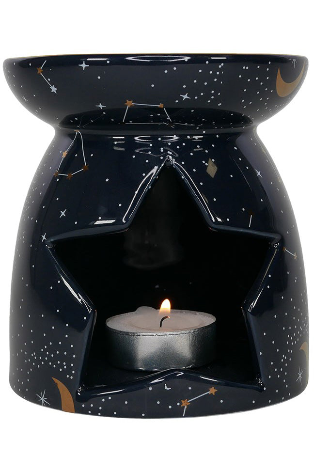 This stunning oil burner and wax warmer features an all-over celestial design with shining gold moon accents. A star cut out shape holds a single tealight and creates a magical ambience when paired with wax melts or fragrance oil.