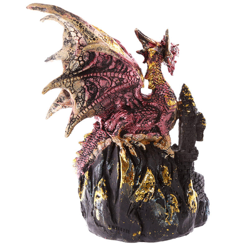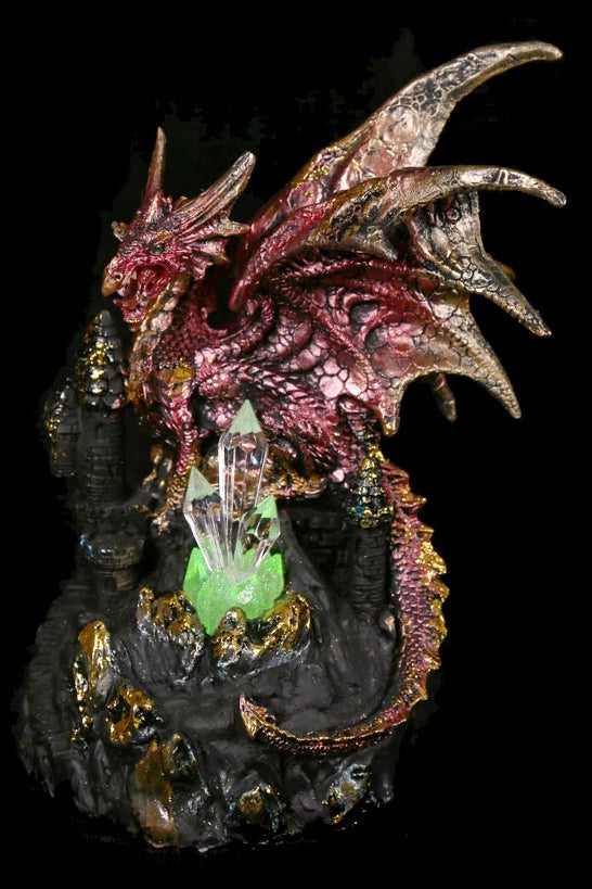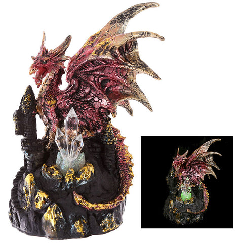 Red and Gold Dragon Sitting atop a Black Castle on a tall Raocky Outcrop. In front of the Dragon are 3 crystals with LED Light. Made from high-quality resin and hand-painted.