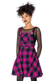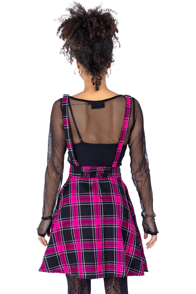 Crafted from a comfortable polyacrylic fabric, the Maeve Pinafore offers both style and comfort. The vibrant dark pink tartan check pattern is a standout feature, adding a playful yet rebellious edge to the dress. The adjustable shoulder straps offer versatility, allowing you to wear them straight or crossed over for a unique look.