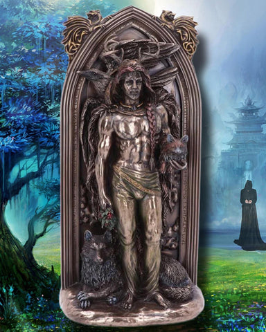 This magnificent figurine comes from the mind of fantasy artist Ruth Thompson. Cast in the finest bronze resin before being painstakingly hand-painted, this piece shows a guardian of the forest. Stood in a pair of green pants held in place with a golden belt and a fur cape draped over his back, this being has his muscular torso exposed. Looking forward with an air of wisdom, his majestic antlers emerge from beneath his long plaited hair. In his left hand, he cradles a small fox, and in his right, he holds a sprig of holly. Around his feet, a wolf rests as a large Raven takes to the sky from behind his head. Perfect for those who are at one with nature, this fantastic Druid figurine is the perfect centrepiece for any altar or coffee table.