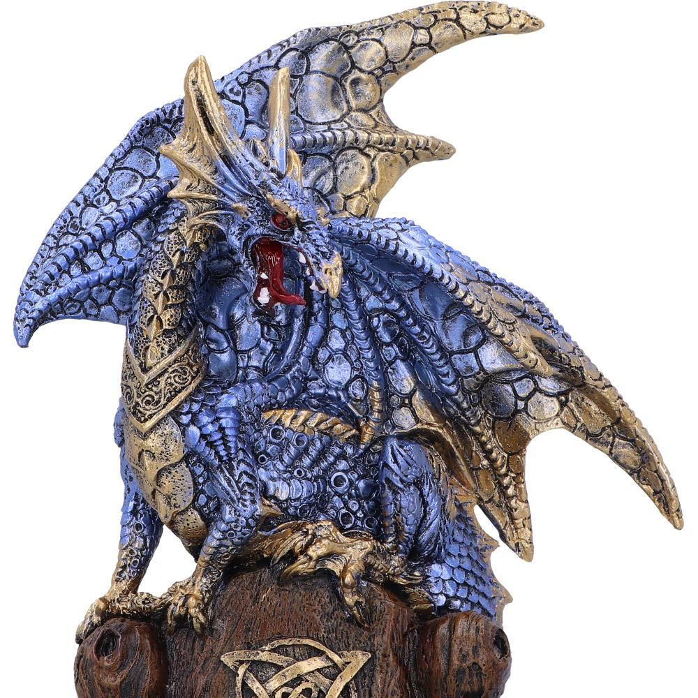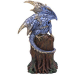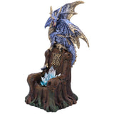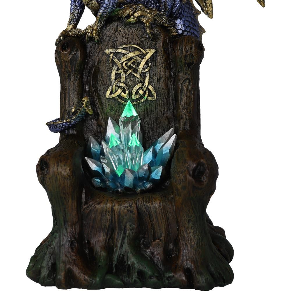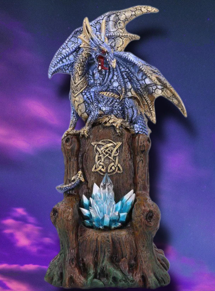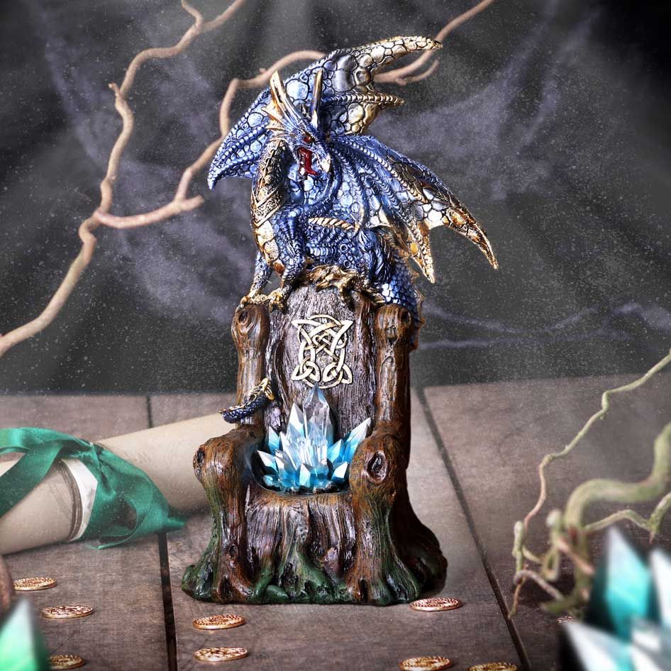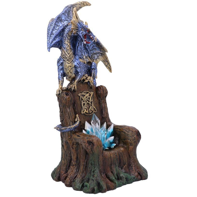 Gripping onto the top of this bark throne, a blue metallic Dragon has landed. Featuring large wings with golden accents, this Dragon stands on guard protecting the blue crystals placed upon the throne. Cast in the finest resin before being expertly hand-painted, the crystals within the figurine light up with LED lights, adding and extra touch of magic to your home!