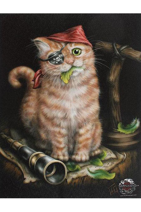 Prepare to be captivated by the adorable scallywag in Linda Jones' "Pirate Kitten" picture at Angel Clothing! This purrfectly piratical artwork features a fluffy kitten dressed as a pirate captain, complete with an eye patch, a tricorn hat, and a tiny treasure chest. Rendered in the whimsical style of Welsh fantasy artist Linda Jones, this picture is sure to melt the hearts of kitten lovers and pirate enthusiasts alike.