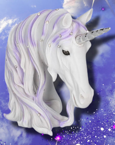 This enchanting unicorn bust is filled with magic. Looking ahead, this small white unicorn stares with deep, black, soulful eyes. Their silver horn spirals forward from their head, and their jewel-studded mane and beard is tinged with violet. Cast in the finest resin before being carefully hand-painted, this fantastic bust makes a great addition to any side table or mantelpiece.