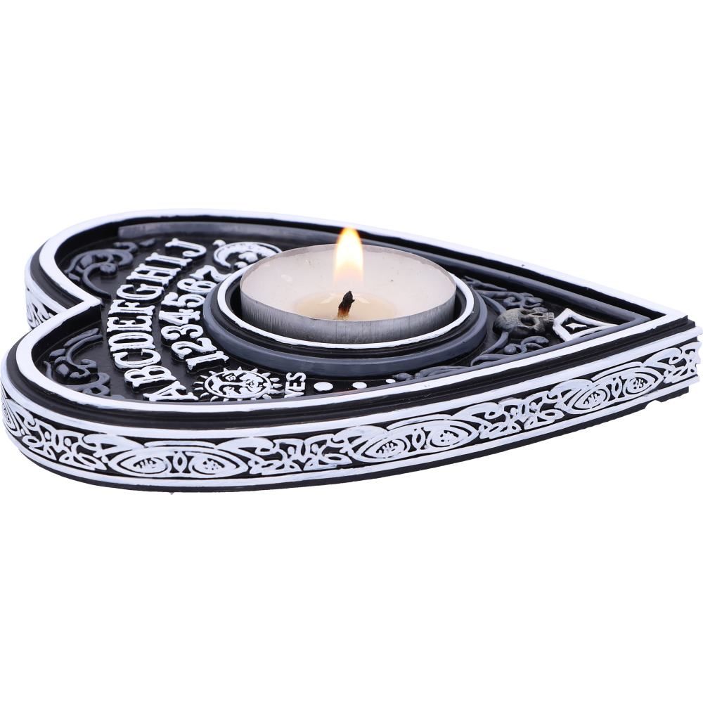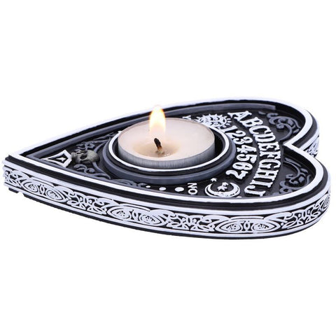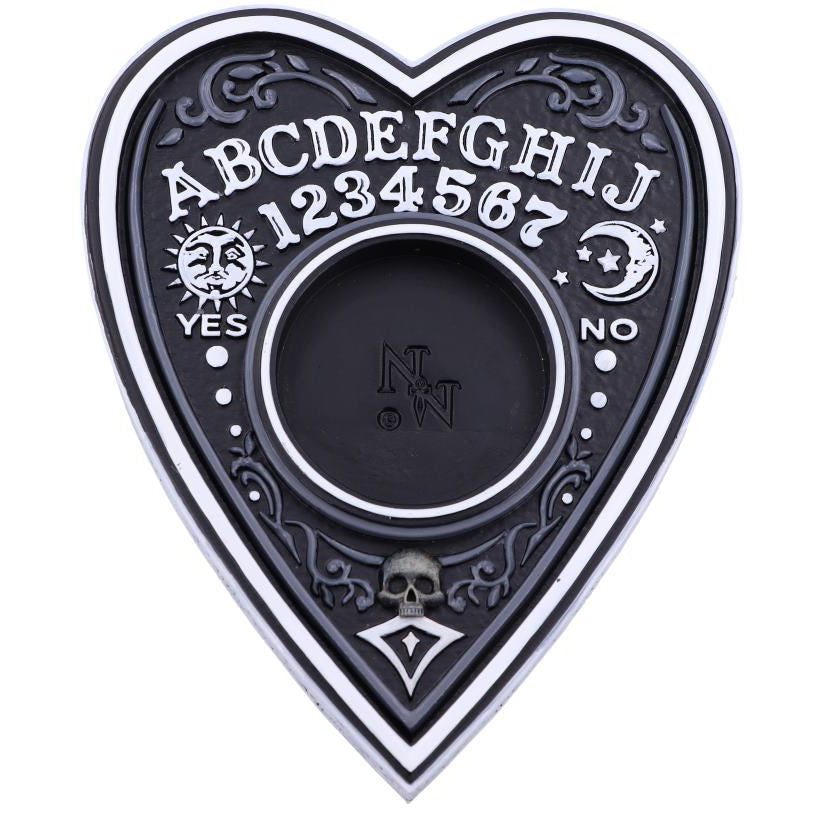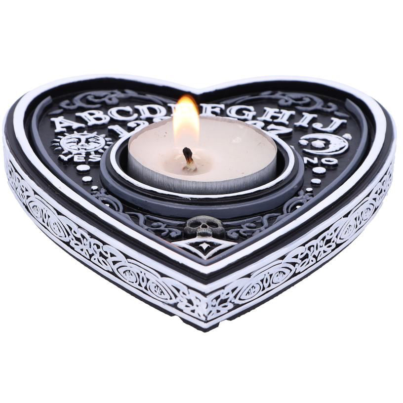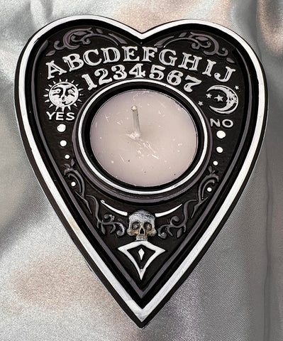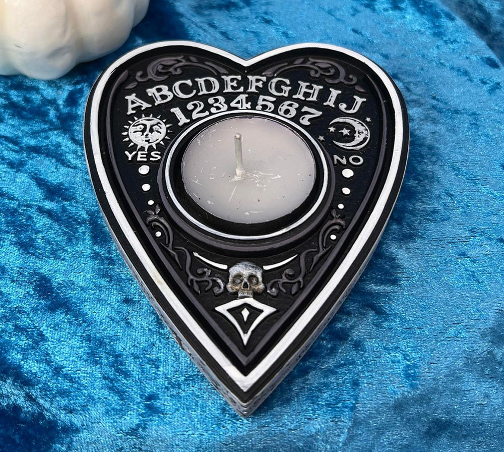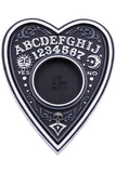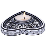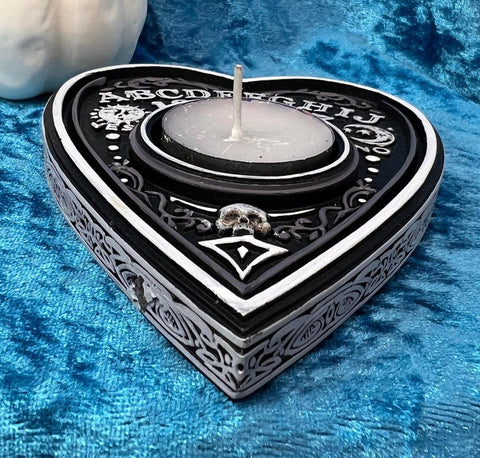 This tea light holder is inspired by the Planchette - a heart shaped piece of wood with multiple wheel casters and a pen aperture held on the underside, which is used to facilitate automatic writing, leading to the creation of mysterious messages created by a medium as they communicate with receptive spirits as apart of a séance. This black heart shaped tea light holder is decorated with our original white ornate design. Holding a single tealight, this piece is perfect for both decorative lighting and ritual use, and is sure to be the centre of your spirit board collection.