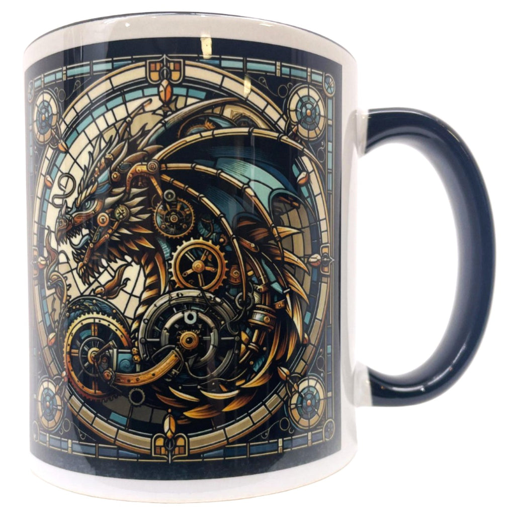 Crafted with meticulous attention to detail, the mug features a captivating blue dragon with a body intricately composed of cogs and engines, a hallmark of the steampunk aesthetic. The sleek black interior and handle provide a striking contrast to the vibrant colors of the dragon, creating a visually stunning piece. Designed to be both functional and aesthetically pleasing, the Steampunk Blue Dragon Mug is the perfect size to hold your favorite beverage, whether it's a comforting cup of tea or a revitalizing coffee. Its sturdy construction ensures durability, while its elegant shape is a delight to hold.