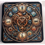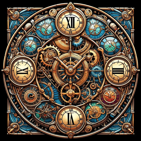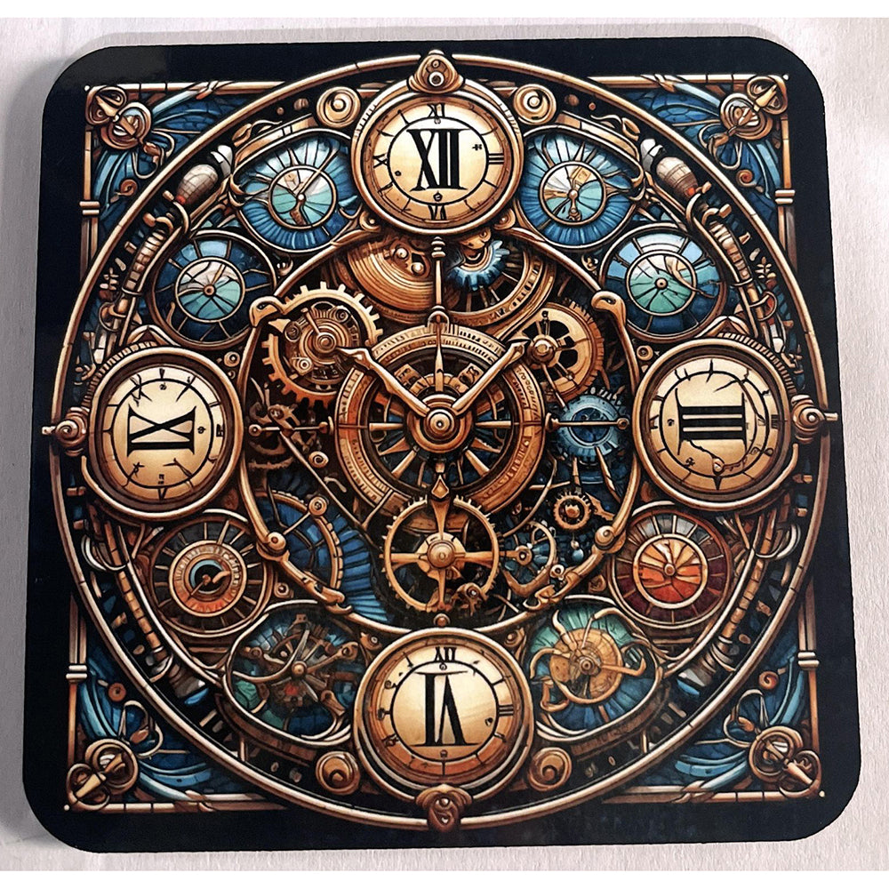 Steampunk Cog Clock with a stained glass window backdrop.