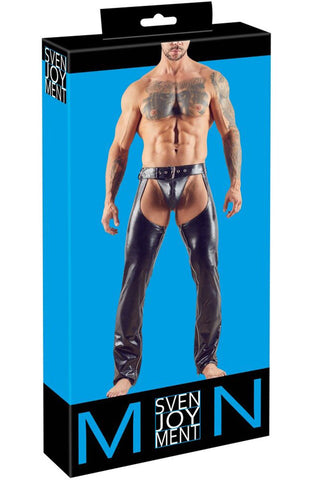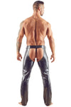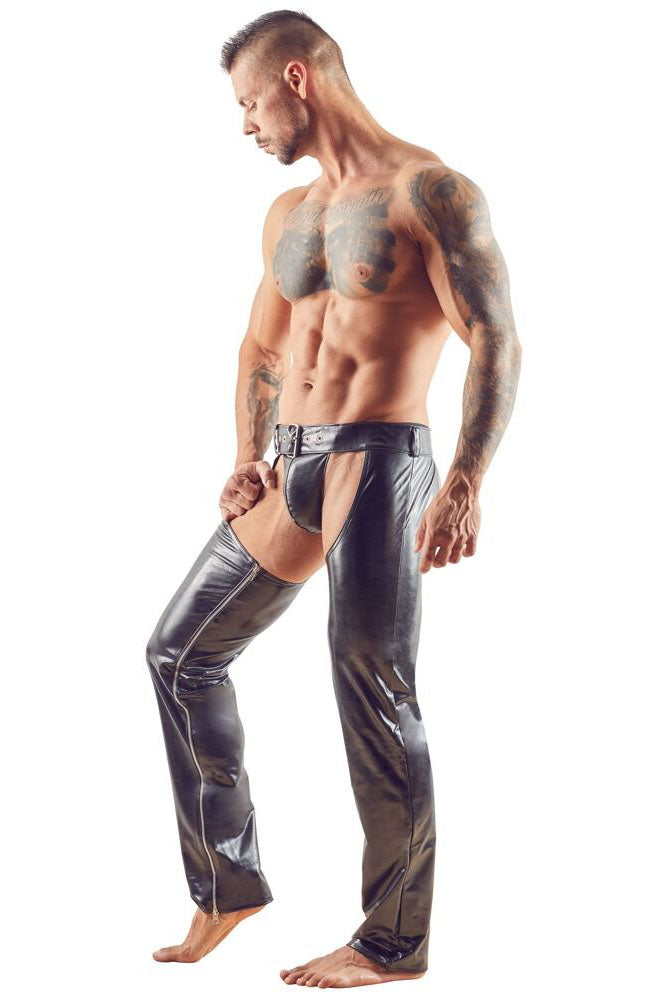 In a sexy leather look! Powerful duo: black chaps with a two-way zip on the inside of the legs and a matching sexy string - both are made out of slightly stretchy imitation leather.