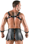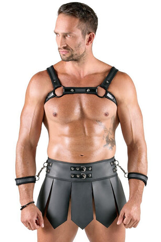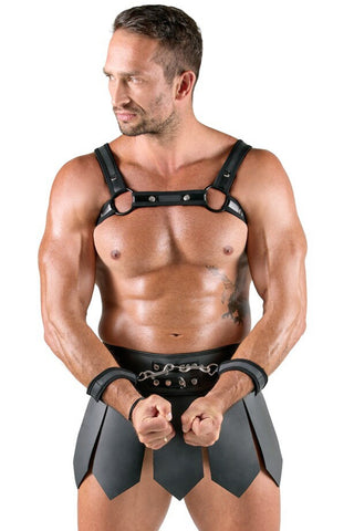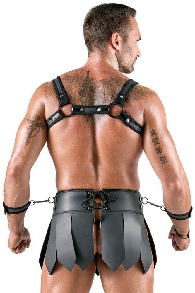 • Complete Gladiator Look: This set includes everything you need for a compelling gladiator fantasy: a chest harness, a gladiator skirt, and two soft handcuffs.