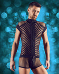 Let's a man show off what they have! This playsuit with short sleeves puts its wearer in the limelight! The two types of net and the trendy stripe design allow cheeky glimpses. Zip at the front and a padded zip on the pouch.