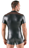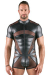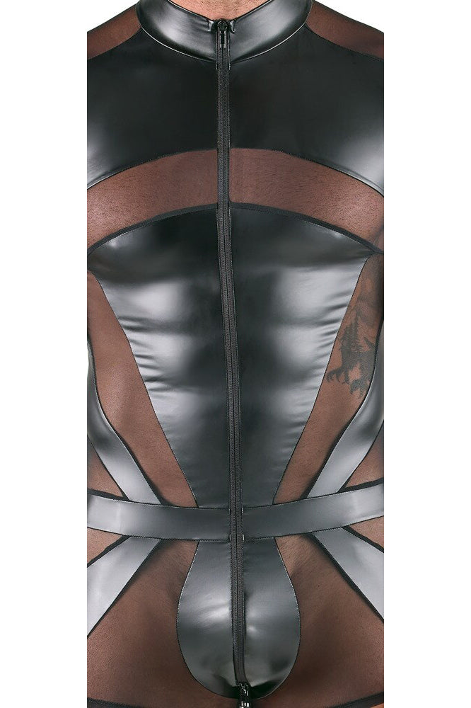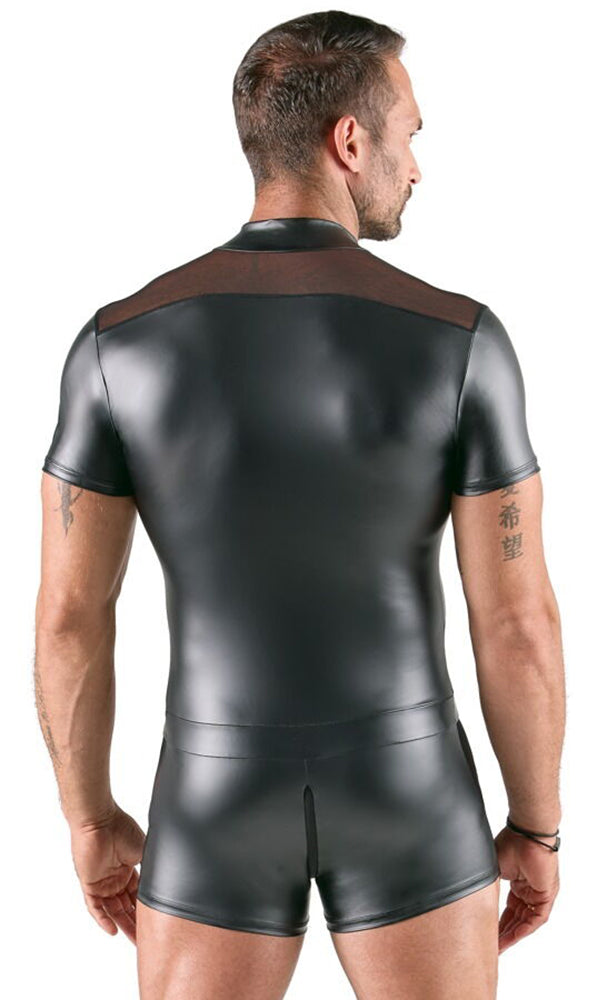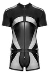 Eye-Catching Material Mix: The playsuit is crafted from a tight-fitting, opaque matte-look fabric combined with strategic, transparent powernet inserts. This blend of materials creates a captivating contrast and a powerful visual effect.