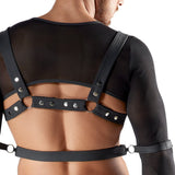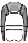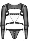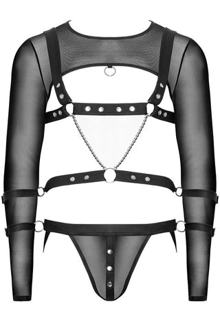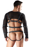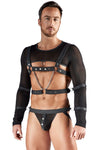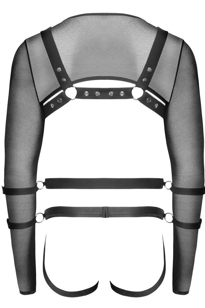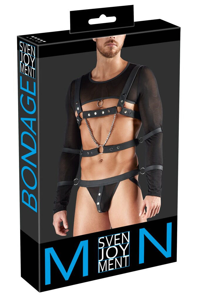 A captivating look with lots of extras! The black set from Svenjoyment BONDAGE contains a crop top, chest harness, jock and 4 handcuffs/arm restraints. The open chest crop top and the open back jock are made out of soft and stretchy powernet and have decorative matte look details as well. The top also has long sleeves and a ring at the front. The jock has a row of press studs over the pouch. The harness has adjustable matte look straps (press studs), chains and rings. There are rings at either side of the stomach strap and the jock's waistband, which can be used for attaching the included restraints. The soft restraints can be put on quickly and adjusted with the hook and loop fasteners.