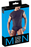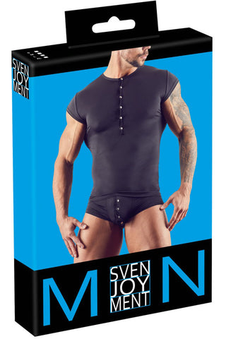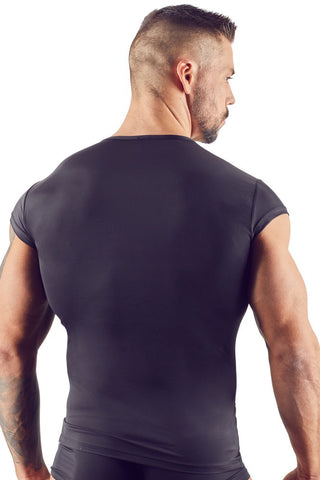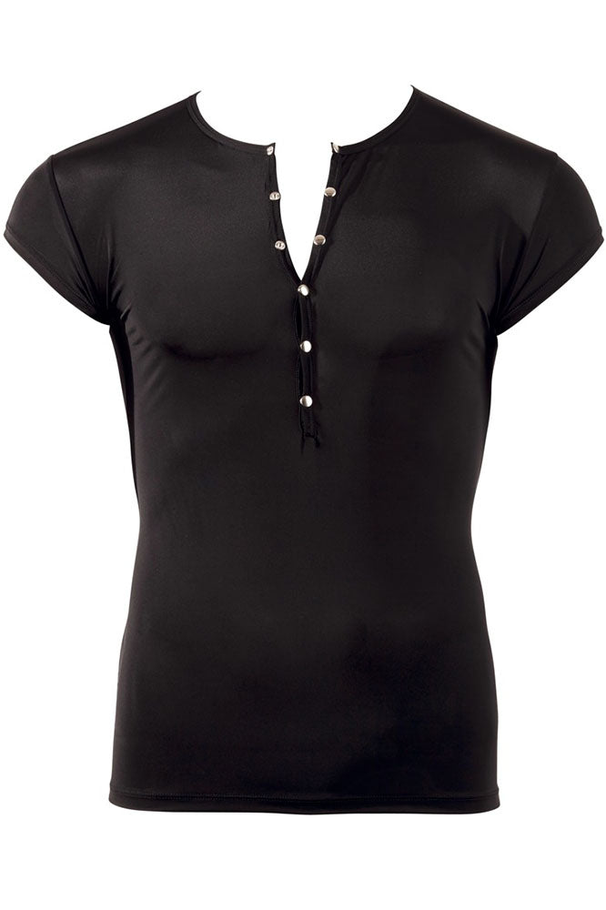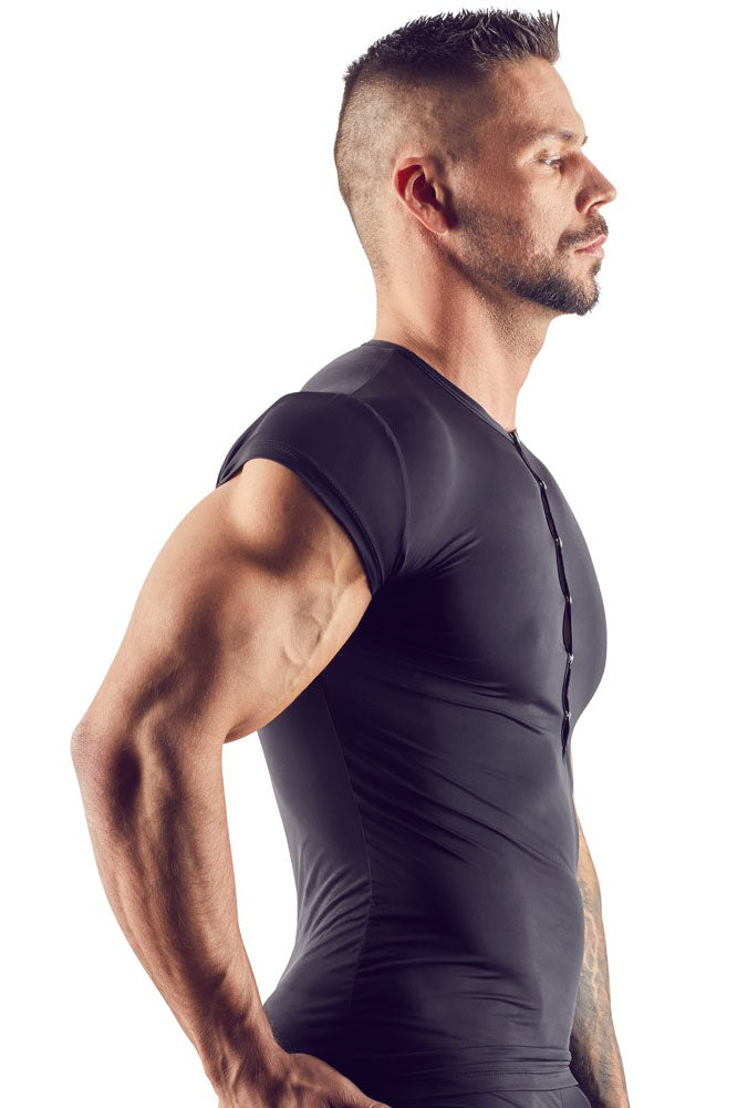 Attention all men! This slightly transparent shirt made out of thin stretchy microfibre will put you in the limelight. With short sleeves and silver-coloured press studs at the front.