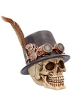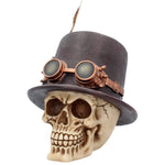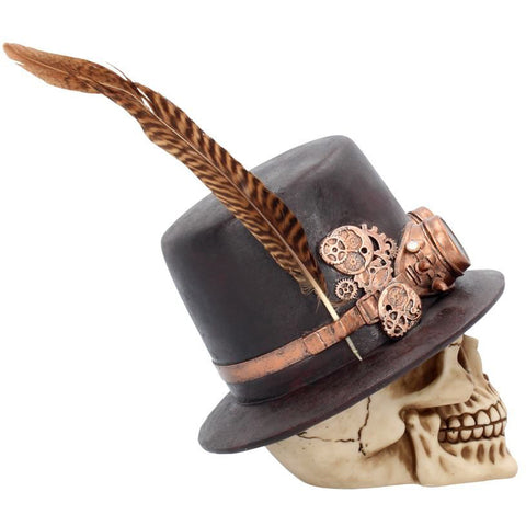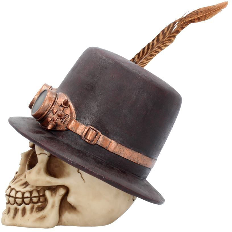 This unfortunate aristocrat has lost their head! Grinning merrily, this skull wears an elegant top hat with a stylish brown feather in it. Sitting atop the brim is a pair of brass goggles. Brass cog work crawls across the hat next to them. Cast in high-quality resin before being expertly hand-painted, this Steampunk skull makes the perfect gift for any adventuring aristocrat.