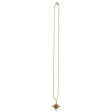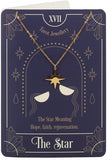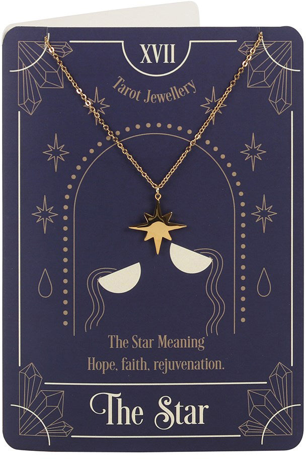 A mystical gold-tone starburst necklace beautifully presented on a matching greeting card perfect for gifting. Inspired by the art of tarot reading. 22cm chain with lobster clasp closure. Nickel-free stainless steel. Includes metallic envelope. Card left blank inside.