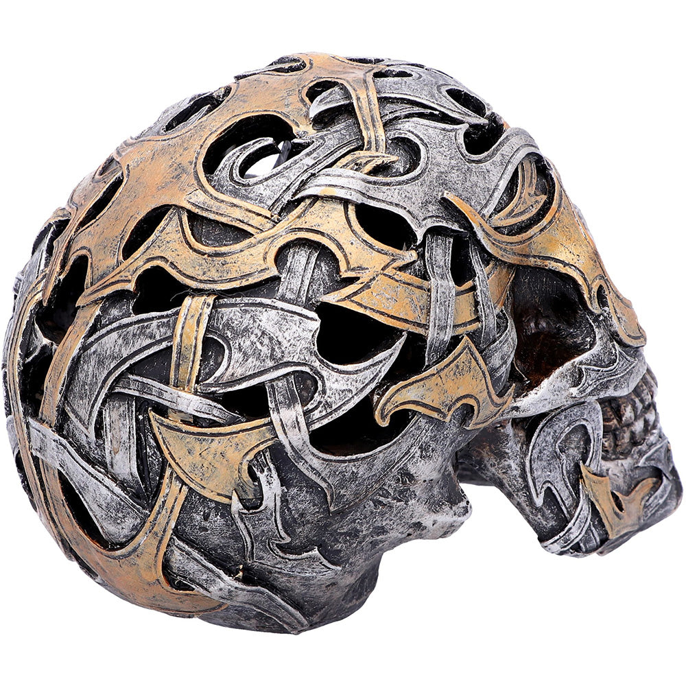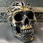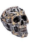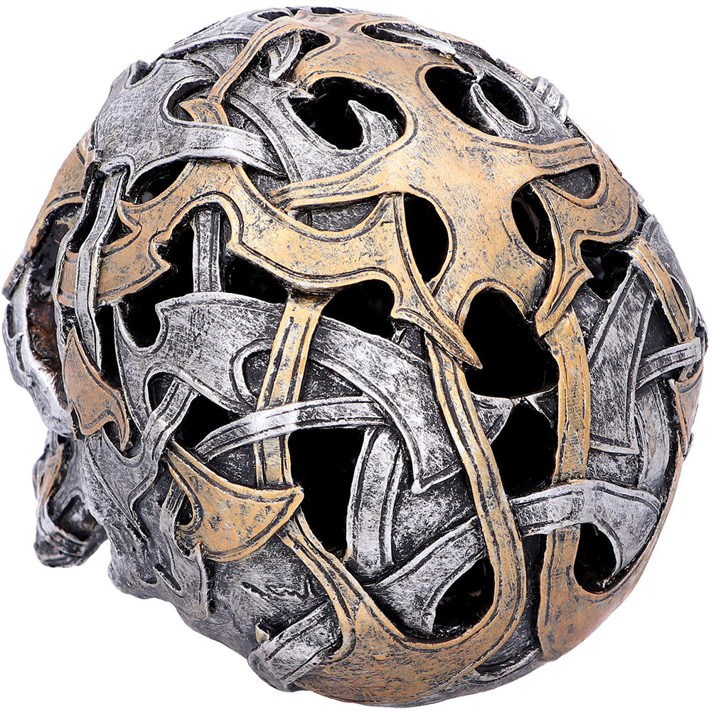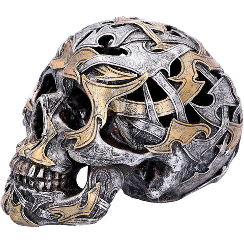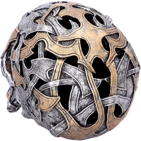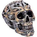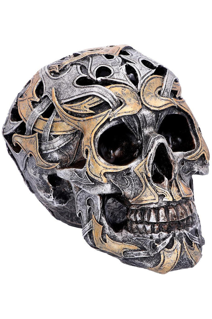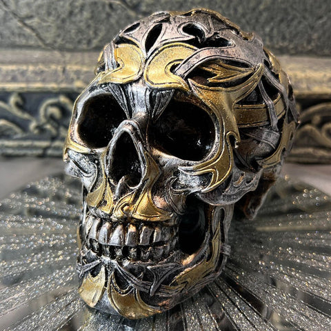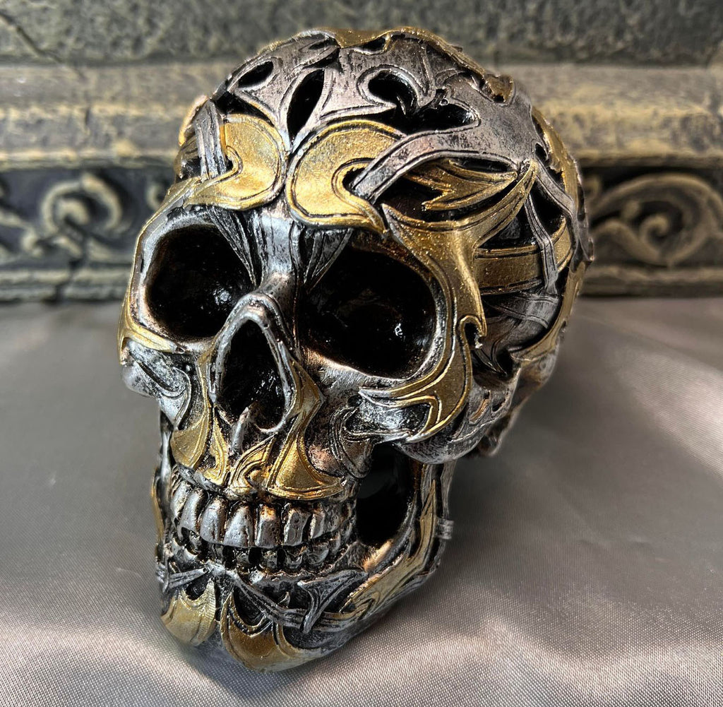 Covered in silver and gold, this skull looks as though it is entombed in traditional tribal patterns. The eye sockets and nasal aperture have been darkened to add to its menacing look while its teeth mirror the silver that can be seen throughout the skull. Cast in the finest resin before being carefully hand-painted, this skull is an essential part of any Gothic, Fantasy or Steampunk collection.