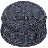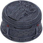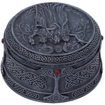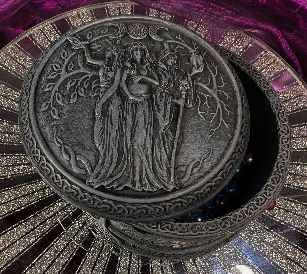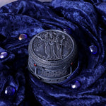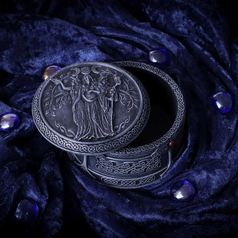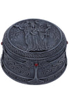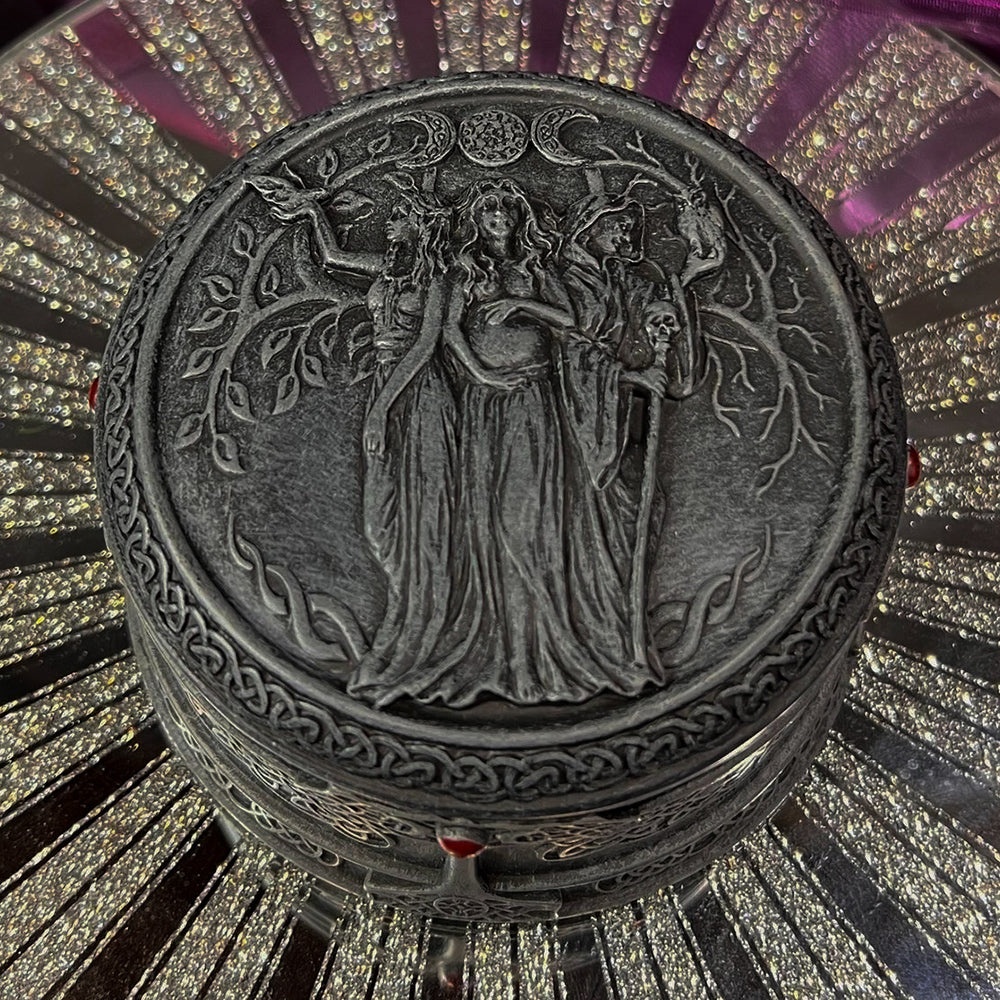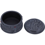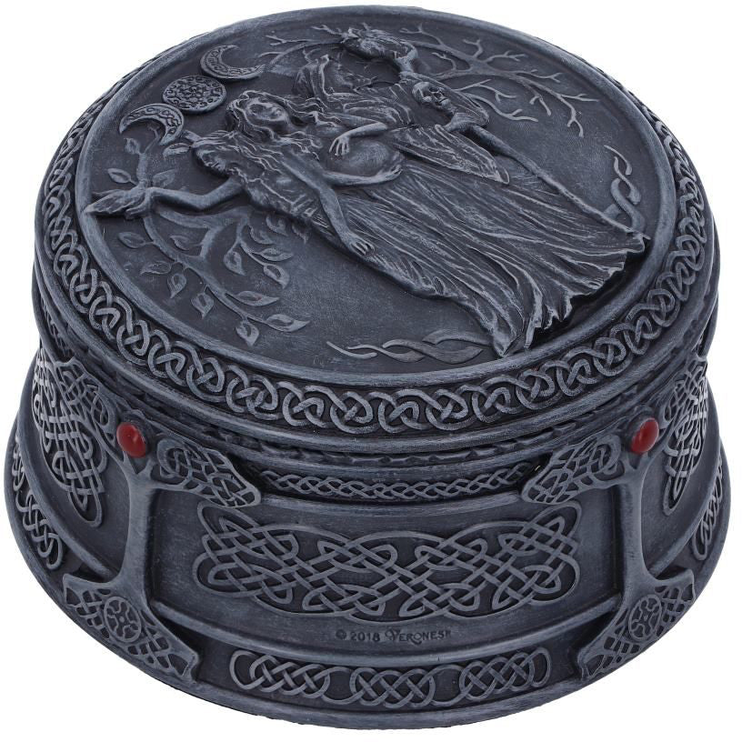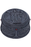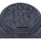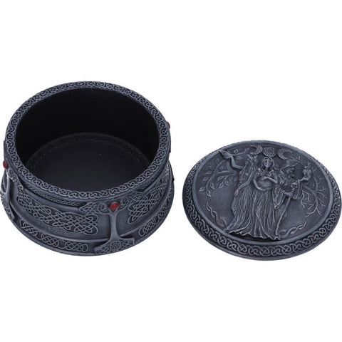 Keep your most treasured belongings safe with the Triple Goddess Box, cast in high-quality resin before being expertly hand-painted. The lids main focus is on the portrait of the three women, with three moons above their heads, each symbolising something unique. A waxing crescent symbolising youth and growth, the full moon symbolising fertility and creation of new life and finally a waning crescent moon symbolising wisdom and mastery of magic. The outer edge of the box features networks of small knots and ruby red circles at the top of each tree.