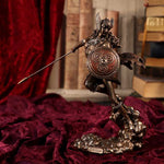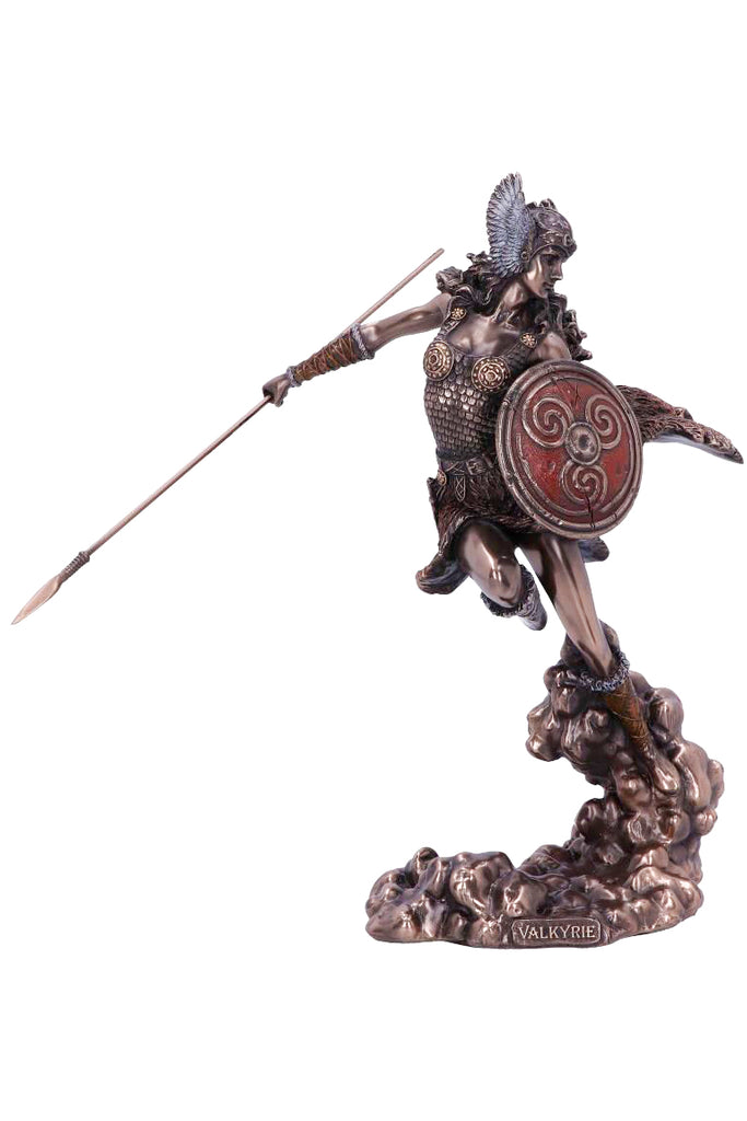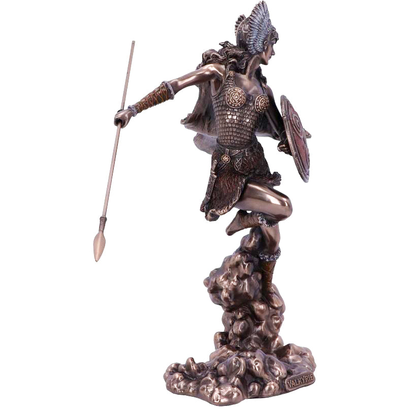 Cast in the finest resin before being given a bronzed finish. The Valkyrie is one of a host of female figures who choose those who may die in battle and those who may live. Here we can see the Valkyrie floating through the clouds, shield in her left hand while she holds a spear in her right. She surveys the battle to see who is truly worthy of Valhalla.