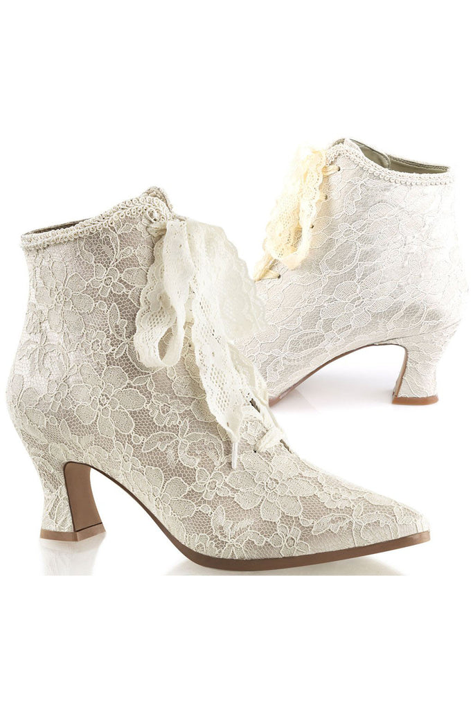 Champagne leather effect boots with lace overlay, 2.75 inch flared heel and ribbon bow tie. Victorian and Steampunk Boots.