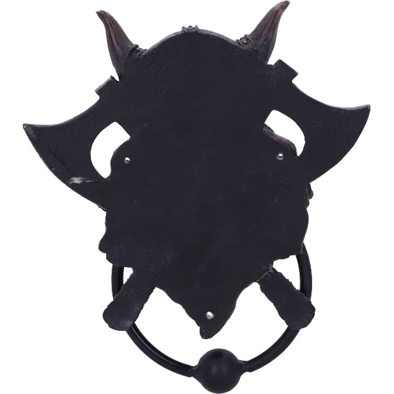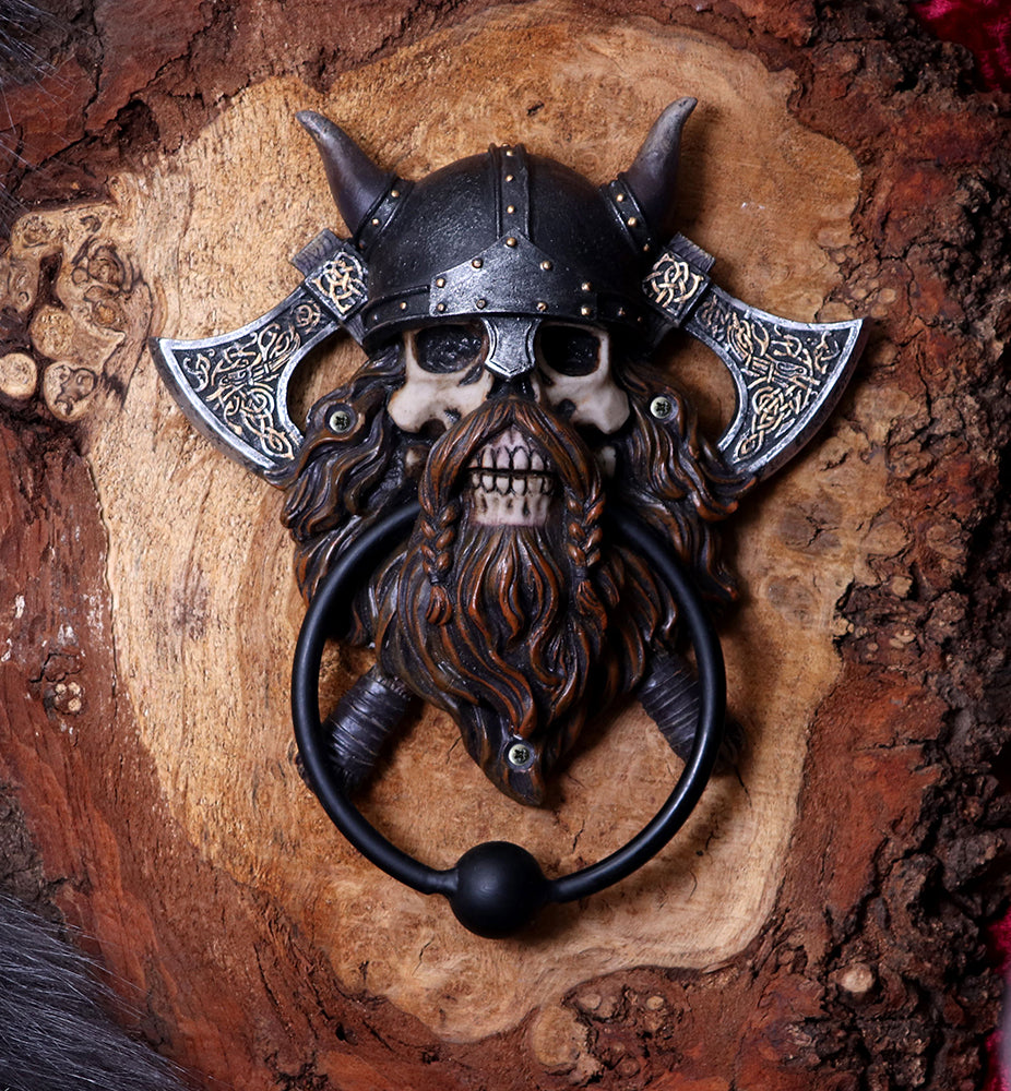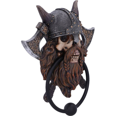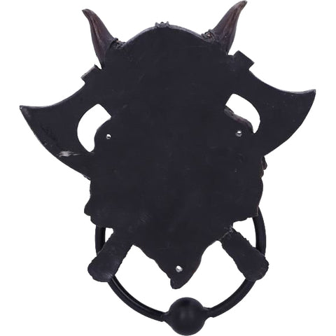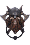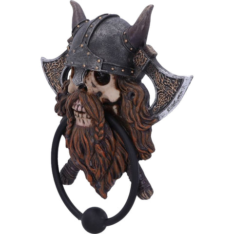 A fierce Viking skull stares outwards in front of 2 crossed battle axes either side of his helmet. His thick brown beard is braided ready for battle and he grins in an evil manner waiting to make his first attack. Cast in the finest resin before being expertly hand-painted, the knocker part of this door knocker is a metal ring which is weighted to provide a loud knock. A perfect piece for any Viking lover.