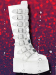 Embrace the future of fashion with the DemoniaCult DAMNED-318 White Vegan Leather Boots from Angel Clothing. These statement knee-high boots combine edgy details with a touch of futuristic flair, perfect for those who want to stand out from the crowd.