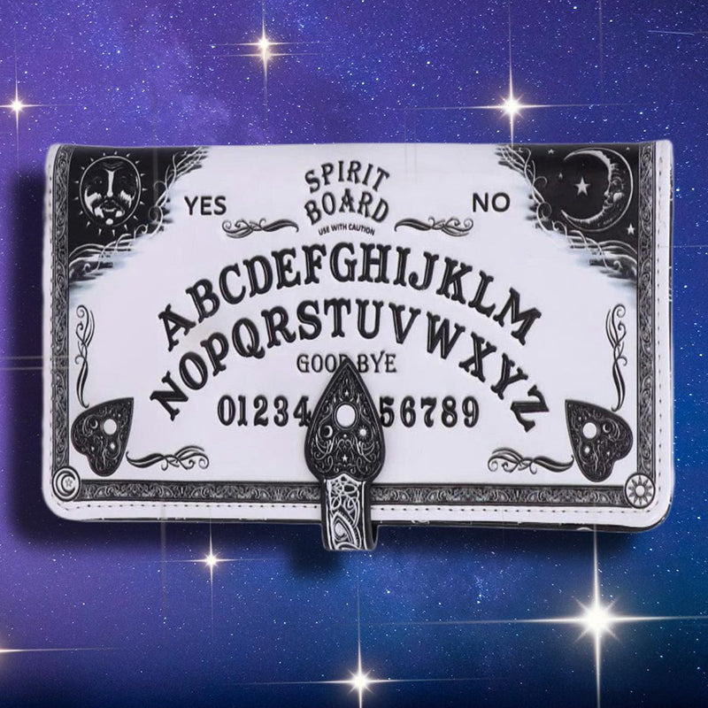 This embossed Purse is a stylish addition to any outfit. Spirit boards have long been one of the most powerful occult tools there is. Bordered with intricate baroque designs, the background is white and has the alphabet marked out in an arc. Each side of “Goodbye”, two ornate planchettes are pointing towards the centre, as if ready to move. The design also includes numbers 0 to 9 and the words YES and NO, as well as a warning to use with caution – the power of the spirit world is not something to take lightly. The beautiful embossed detailing enhances the magic and creates a striking 3D effect.