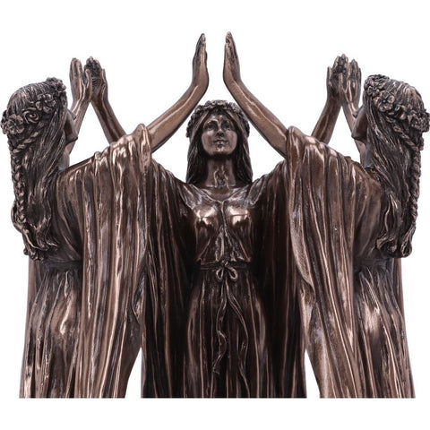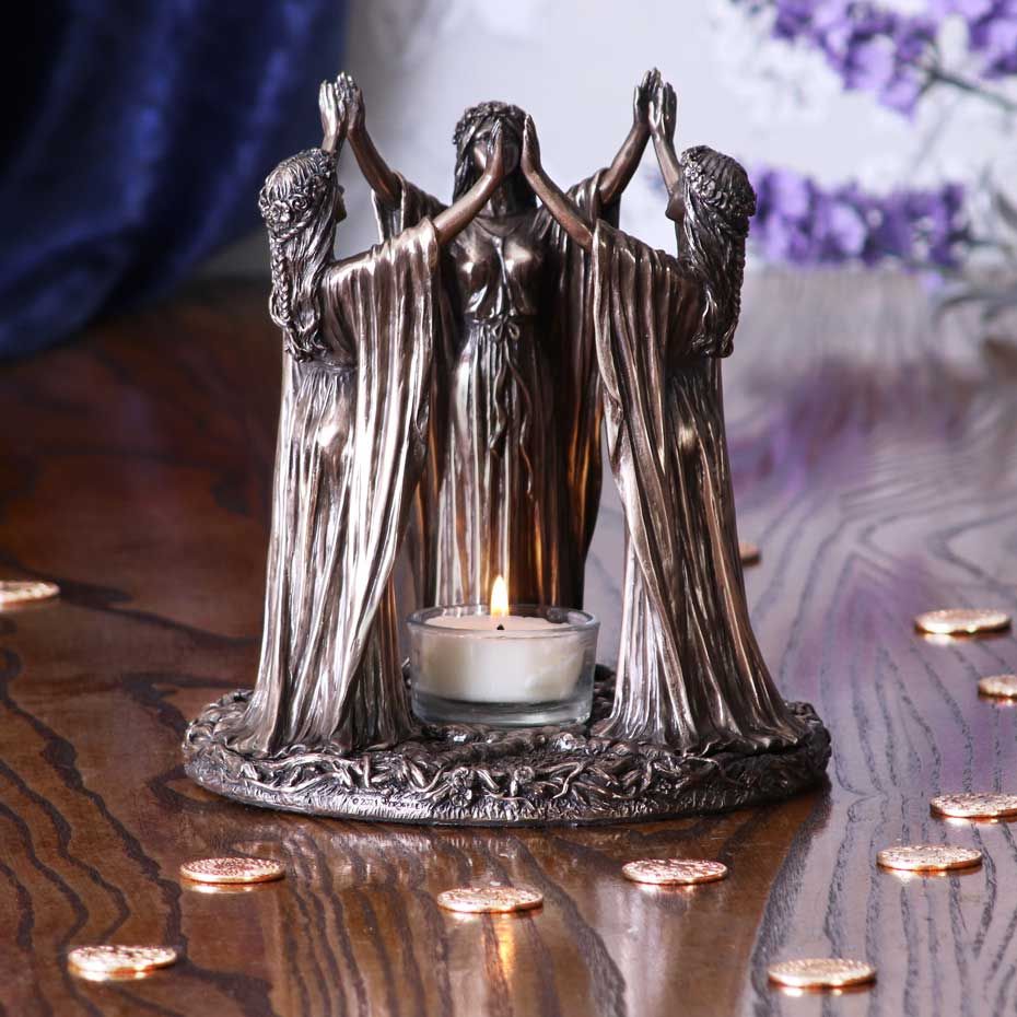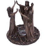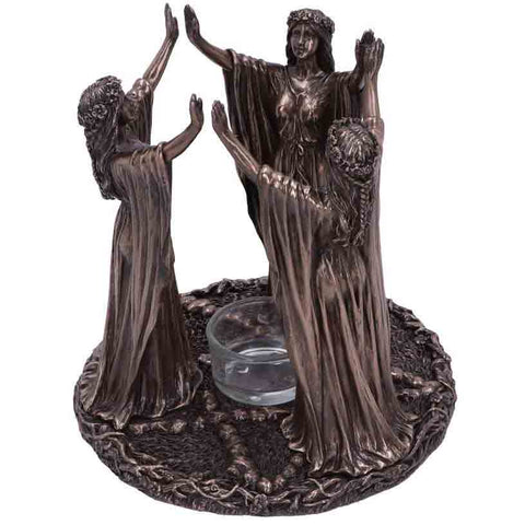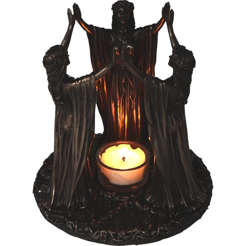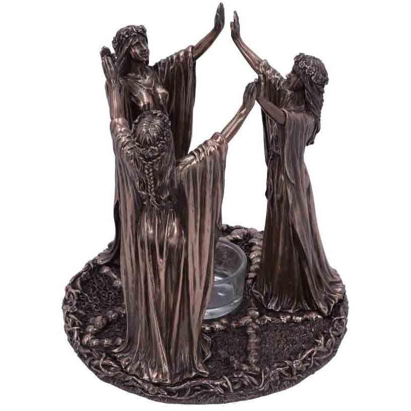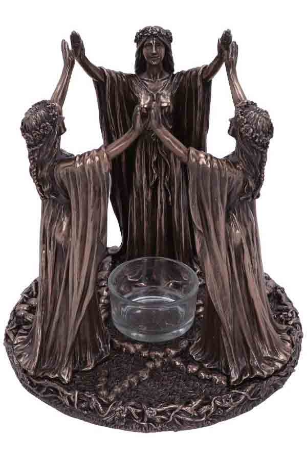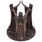 Featuring 3 young women, arms up in the air, hands palm to palm, dressed in long draping dresses with delicate flower crowns resting on their heads. The base of the candle holder consists of a pentagram engulfed in earthy tree roots with the holder placed central ready for you to pop in your candle. Cast in the finest resin before being finished in bronze, this will make to prefect addition to any room.