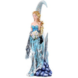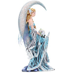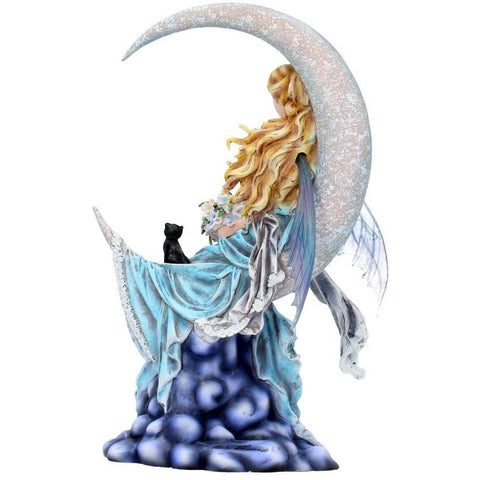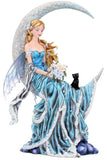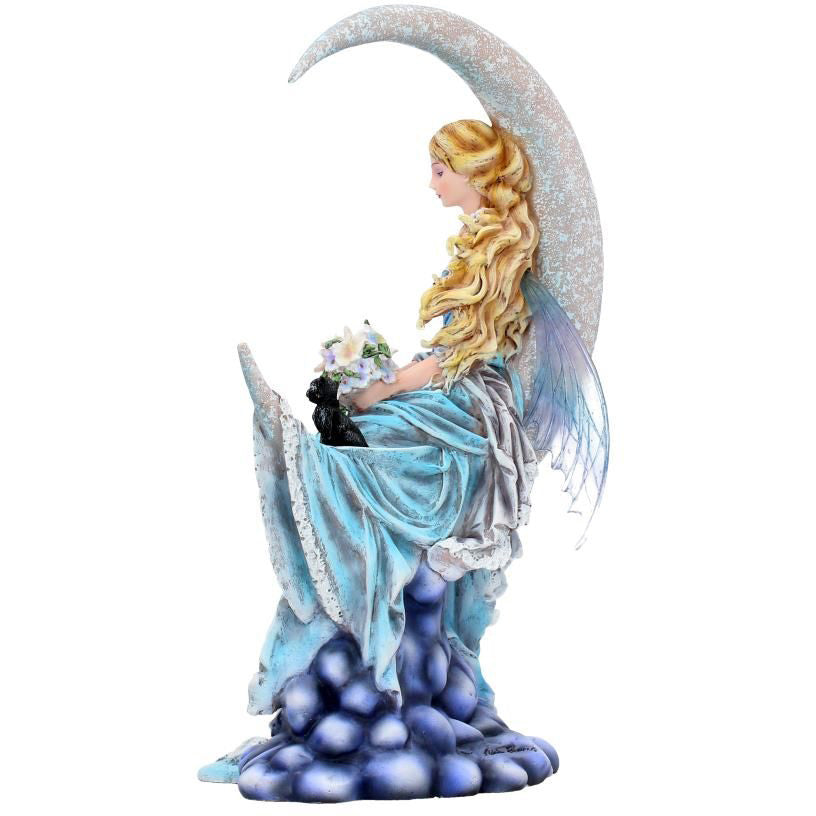 From the magical imagination of internationally renowned Fantasy artist Nene Thomas. Sitting on the curve of a crescent moon, this lonely Fairy quietly smiles to herself, a bouquet of blue and white flowers in her hand. Her delicate blue wings hang down forlornly behind her, and her long, blue dress hangs down below her, voluminous blue folds and white trim looking like sea foam. Blue flowers are fixed in her long blonde hair as it blows in the wind. A small black cat also sits on the wind moon, staring upwards sadly. Cast in high-quality resin before being painstakingly hand-painted, this enchanting figurine adds a dreamlike aura to any space it’s in.