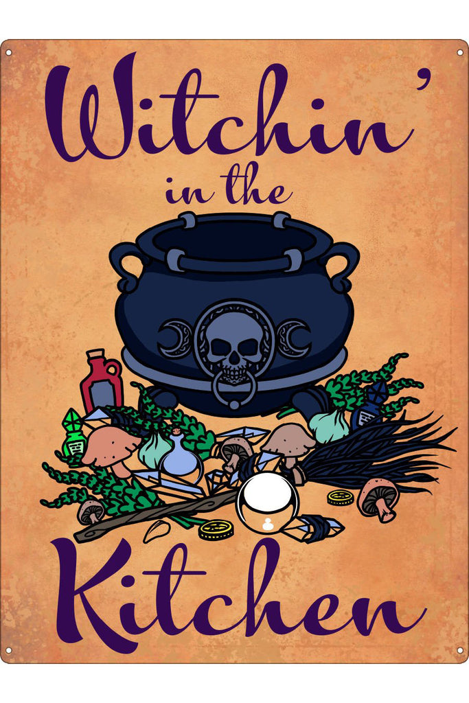 Crafted from high-quality tin, this sign boasts a vintage-inspired look that adds character and charm to any kitchen. The playful "Witchin' in the Kitchen" text is paired with captivating artwork, creating a truly enchanting display. Whether you're a seasoned witch or simply appreciate a touch of the supernatural, this sign is a must-have for your home.