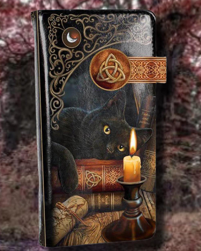 The talented Lisa Parker brings us this beautiful embossed Cat purse featuring her Witching Hour artwork. A black cat stares at a flickering candle, surrounded by books of forbidden and mystical knowledge. The embossed detailing enhances the artwork, creating a striking 3D effect.
