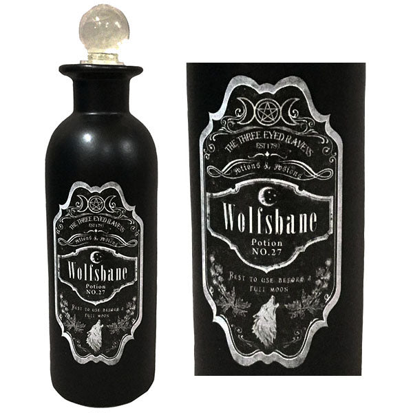 Crafted to resemble an ancient apothecary find, the bottle boasts a sleek black exterior that exudes an air of mystery. The aged "label" etched onto the surface tells a tale of its own, with the inscription "The Three Eyed Ravens, Potions & Poisons, Wolfsbane Potion No.27, Best to use before a Full Moon" adding a touch of eerie enchantment. Above the intriguing label, a pentagram emblem surrounded by the Triple Moon symbol completes the occult aesthetic.