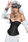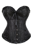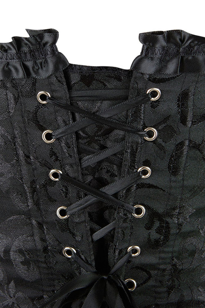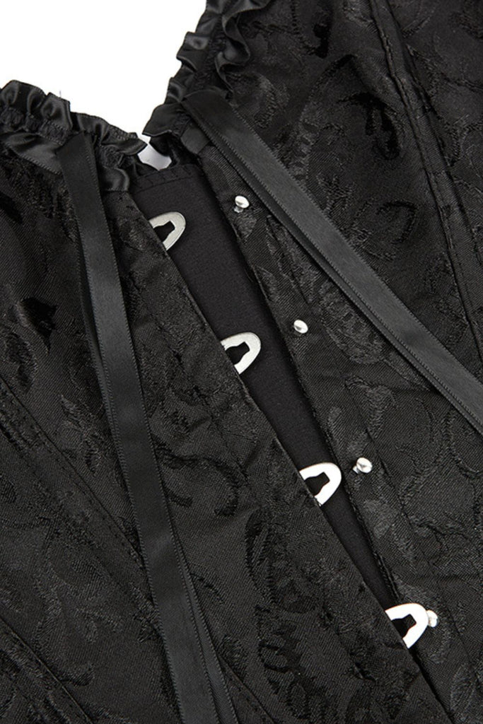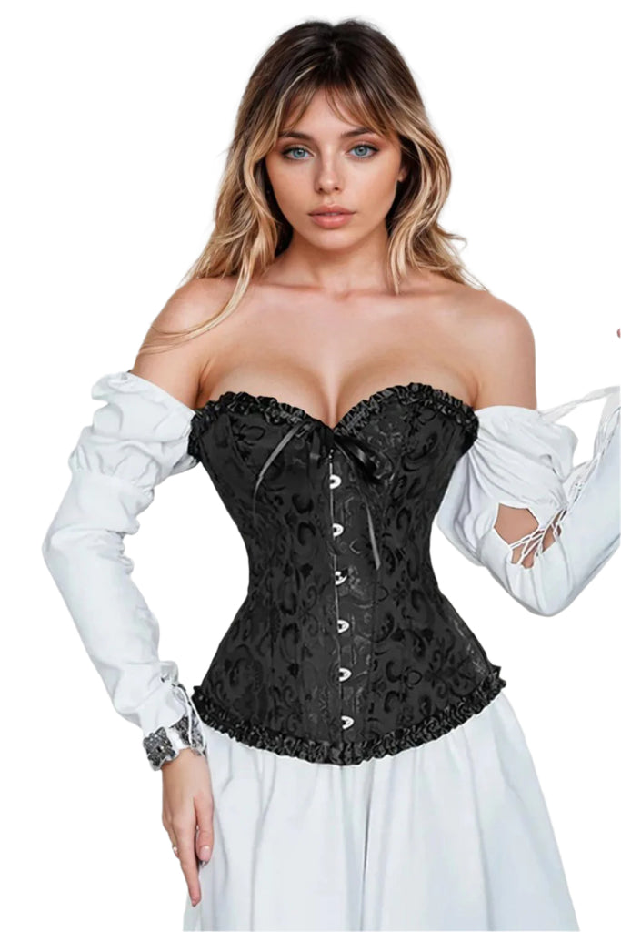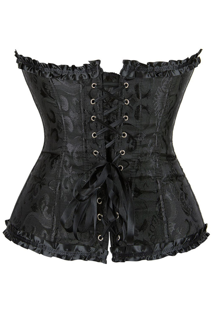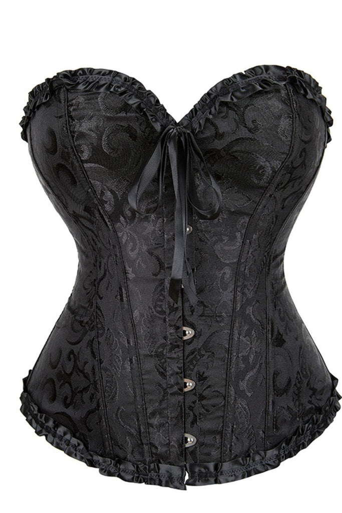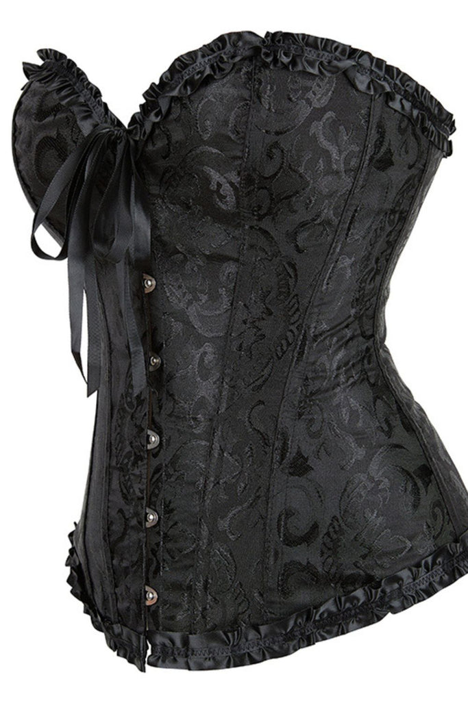 Turn heads and accentuate your silhouette with this stunning black brocade corset. Designed with a vintage-inspired floral pattern, this waist-cinching piece combines timeless elegance with modern structure. The sweetheart neckline is beautifully framed by satin ruffle trim and a centre bow, adding a touch of romance and sophistication.