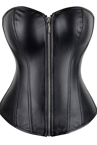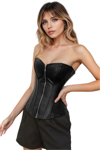 Make a bold statement with this sleek black leather-look corset, designed to sculpt and flatter your figure with edgy sophistication. Featuring a smooth faux leather finish, a secure front zip closure, and an adjustable lace-up back, this corset offers both fashion and function in one stunning piece.