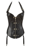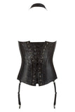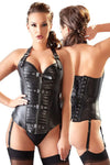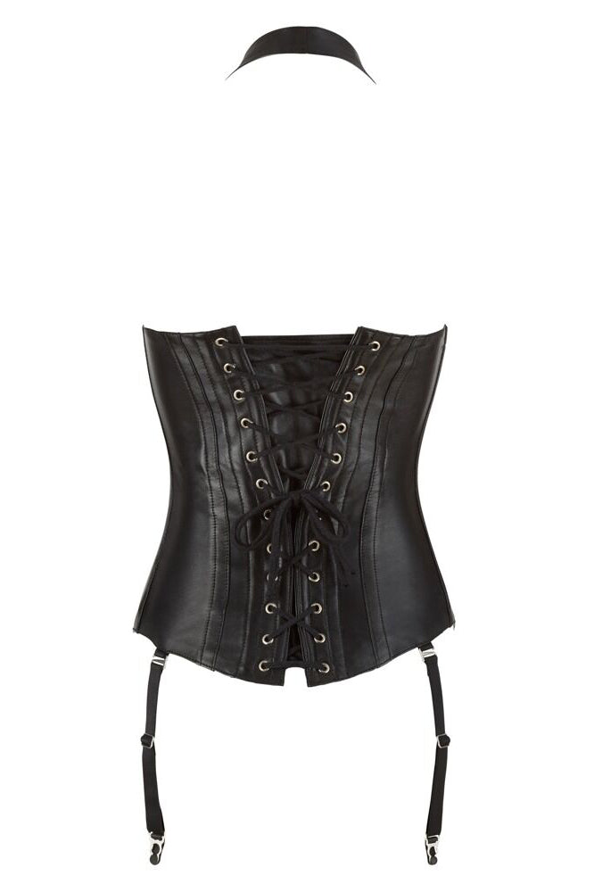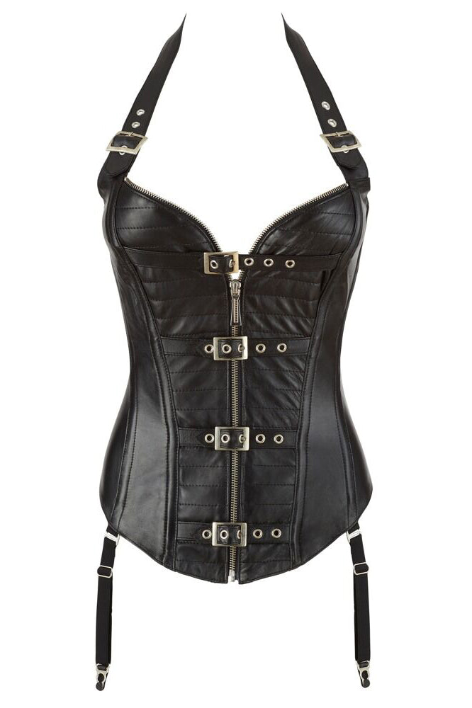 Cool, rock look, high-quality! Corsage made out of lamb nappa leather with stitching in a biker style and a waistband. With a full-length zip and buckles at the front. With lacing at the back – there is a piece of material that can be placed underneath the lacing or folded back so that only the lacing is showing. The bra straps are adjustable. The suspender straps are adjustable and removable. Black. Without string or stockings